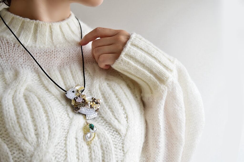 ネックレスにもブローチにもなり、チャームも取り外し可能です。